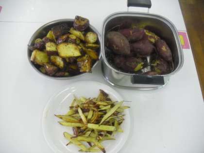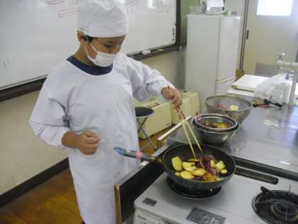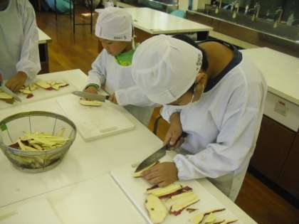 昨日収穫したサツマイモで、調理実習をしました。今日作ったのは、ポテトチップスならぬ、おさつチップスです。サツマイモを細く短冊状に切り、油で揚げて、お砂糖をまぶす、簡単な料理です。それでも、包丁を使うのは、とても緊張します。サツマイモは、柔らかい様で、実は硬くてとっても切りにくいです。力が弱くて経験のない子供たちにとっては至難の仕事です。次に、油で揚げますが、これはとっても危険なので、担任がほとんどあげました。子供たちは、出来上がるのが待ち遠しくて、担任から「試食しようか。」と声をかけると、一目散に集まってきて試食していました。ベテランの4,5年生は、大学イモを作りました。これも、以前に、着くってことがあるので、4,5年生は、以前のことを思い出しながら作りました。給食があるので、好きなだけ食べることができませんでしたが、給食を食べた後、なんだかんだ言いながら、みんなでつまみ、たいらげてしまいました、お芋が少し余ったので、ふかしイモも作りました。これは、日ごろお世話になっている給食調理員や管理用務員さん、職員室の先生方に食べていただきました。もちろん、子供たちもちゃっかりと試食しました。