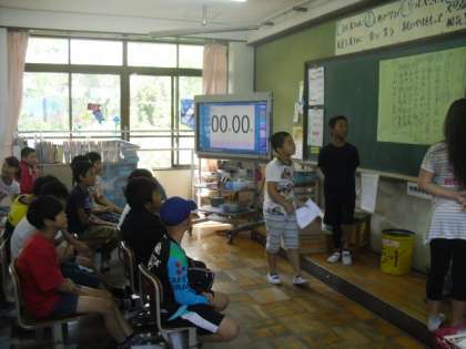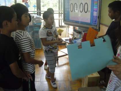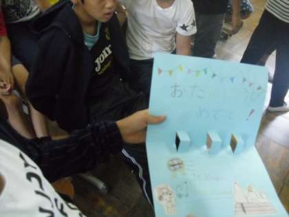 今回は,お誕生係がプログラムを考えて「お誕生会」の拡大版の「お楽しみ会」を行いました。まずは,「初めの言葉」そして恒例の「お誕生カード」渡し。カードには工夫があり,もらった子どもたちは大喜びでした。