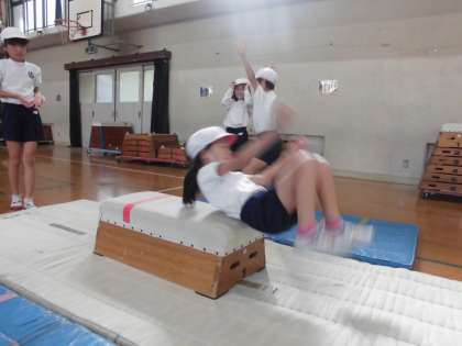 体育で「とびばこ」の練習をしています。今日は台上前転の1段と2段の練習と、縦開脚とびの3段と5段の練習をしました。