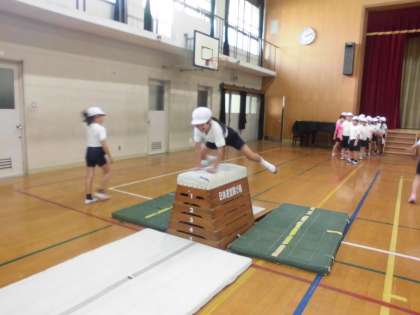 手をしっかり付けて飛び越すことや足をしっかり開脚することを注意しました。