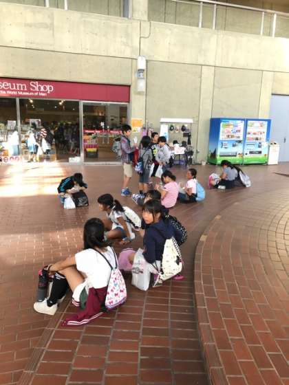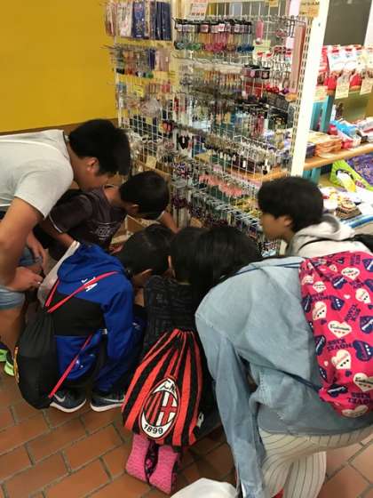 リトルワールドを締めくくるのは、言わずと知れた「お土産ショップ」。疲れも知らずに好みの品を追求する子どもたちもいれば、地面に座り込んでいる子どもたちも...。