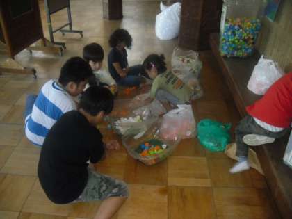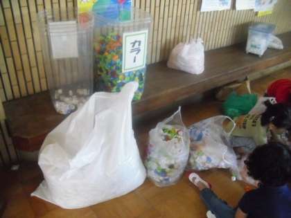 仲間の木の前で、エコキャップを集めています。二つのプラスチックの容器が置いてあり、白いキャップを入れるほうが一杯になっています。おまけに、その周囲には、ビニール袋に入ったキャップが数袋おいてあります。地域の方が、たくさん持ってきてくださったのでしょう。そこで、今日は「たけのこ学級」のみんなで、キャップの分別をすることにしました。白と色つきのものにわけます。結構楽しみながらみんなで分けていたのですが、その数のあまりの多さに、途中からは遊んでしまってなかなか作業がはかどりません。そのうち、交流学習の時間が来たので、1年生は体育の授業に。最後に残ってしてくれたのは、4,5年生でした。3年生も、交流授業から帰ってきて、お手伝いをしてくれました。キャップは、70Lのビニール袋2つ分もありました。さすが、3,4,5年生。ありがとう。