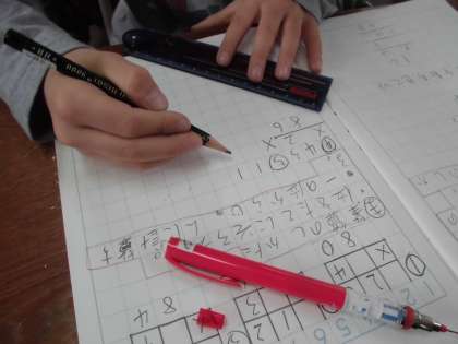 算数で(2けた)×(1けた)のかけ算の勉強をしています。今日はひっ算の勉強をしました。「位をそろえて書くこと」「一の位から順に計算すること」の2つのポイントに気を付けてひっ算の練習をしました。
