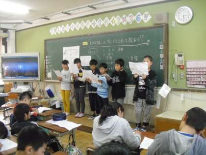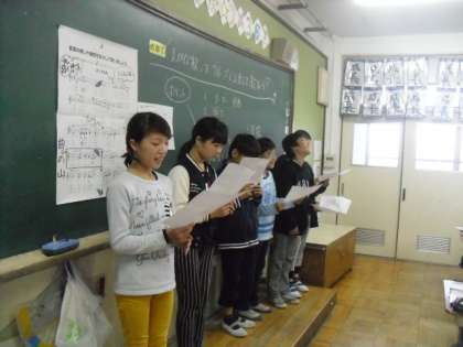 「まっかな秋」の曲を「言葉や曲想にあった歌い方の工夫」をグル—プで考え,歌いました。曲の感じに合わせて「ゆっくり」「やわらかく」「なめらかに」歌っていました。他のグループの歌を聞いて,「工夫がしっかりできていた」というコメントが多くありました。