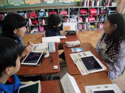 友達にプレゼンを見せながら,