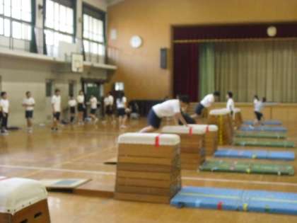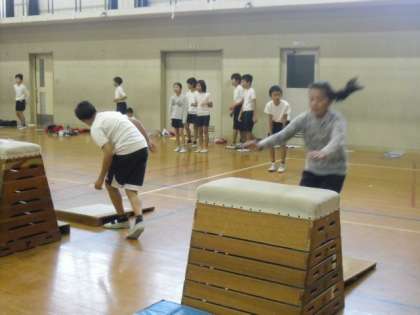 5年生のとび箱運動では,しっかりウォーミングアップした後,ねらい1では「今自分ができる跳び方で高さや向き,踏切板の距離」に挑戦します。ねらい2では「もう少し頑張ればできる跳び方」に挑戦します。跳べる技が増えるようにしっかり学習していきましょう。