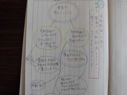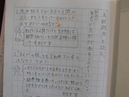 筆者が鳥獣戯画について,どのように感じているかを読み取り,それぞれでノートにまとめました。