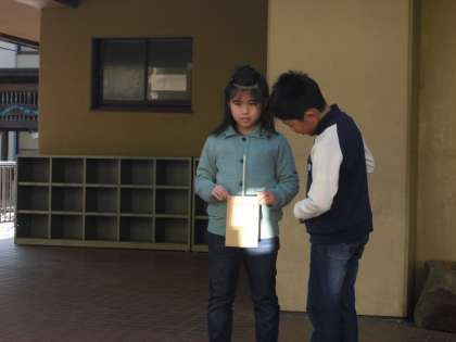 太陽の光の勉強をしています。今日は鏡で反射させた光を2枚3枚と重ねると、明るさや温度はどうなるのかを確かめました。