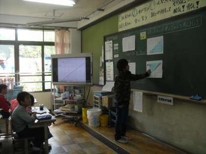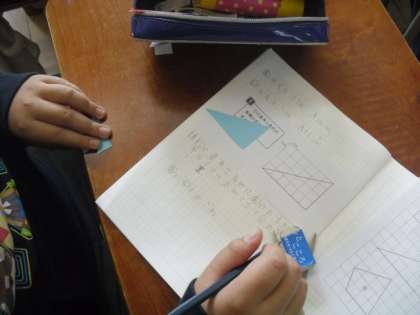 「直角三角形の面積の求め方を考えよう」という「めあて」を持ち,自分で解決しました。直角三角形をチョキチョキはさみで切って,「長方形」を作って楽しそうに面積を求めていました。