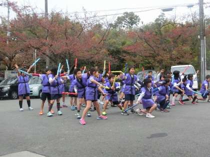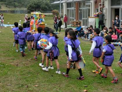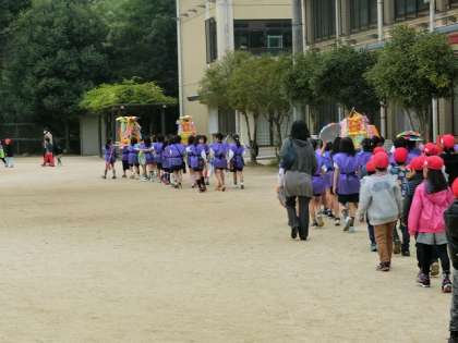 おみこしと花笠を持って,「わっしょいわっしょい!」の掛け声をかけながら行きました。