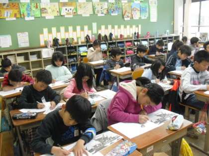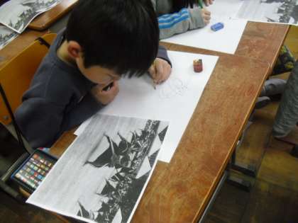 木版画に向けて、続けてきた人物クロッキー。「体操選手」「サッカー選手」とスポーツ選手の写真をモデルに取り組んできて、いよいよ今日は「ロックソーラン」を踊っている児童を描きました。両腕を胸の前で組んでいたり、踊りの衣装を身に着けていたりして、今回はかなりむずかしかったです。でも3回目のクロッキーということもあって、いざ描きはじめると、すごい集中力でがんばっていました。