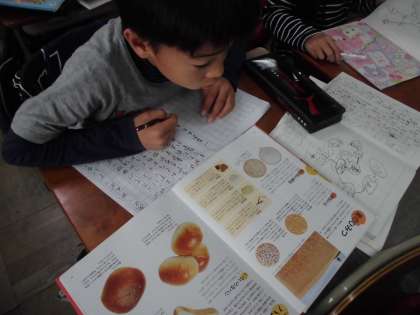 国語で説明文を書いています。今日は昨日書いたメモや本を参考にしながら説明文を書いていきました。構成を考えて書いていきます。