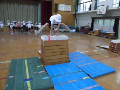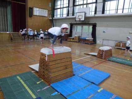 「縦開脚とび」「横開脚とび」の段数をあげて跳んでいきました。また、「横抱え込み跳び」「縦抱え込み跳び」なども挑戦してみました。