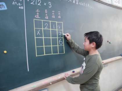 算数で「一桁をかけるかけ算のひっ算」を学習しています。位をそろえて書くことや繰り上がった時の計算方法などを学んでいます。