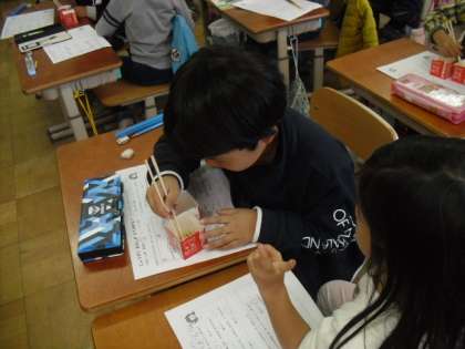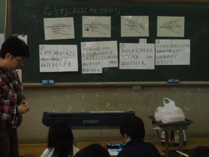 1組は,2回目の食の学習がありました。今回は,「正しいお箸の持ち方」について学習しました。学習の最後に,正しい持ち方に気をつけながら,割り箸で豆つかみをしました。みんな真剣な様子で取り組んでいました。