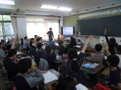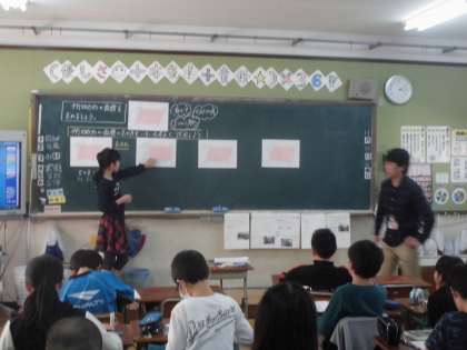 算数で「面積」の学習をがんばっています。今週金曜日の近畿算数研究大会でもたくさんの先生方に「面積」の学習をみていただきます。今週は,金曜日に2組で授業をしていただく重松先生・・・がきて下さり,いっしょに「面積」の学習に取り組みました。名前は同じでも違う重松先生との授業にみんな意欲満々でがんばっています!