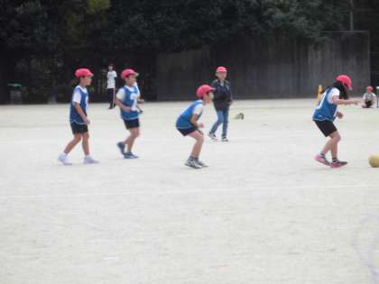 体育で「サッカー」もやっています。今日はパスの練習をしてグループに分かれて試合をしました。ボールを上手くけることや、仲間にパスすることがまだまだ難しいですが、みんな楽しんで取り組めました。