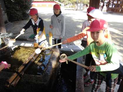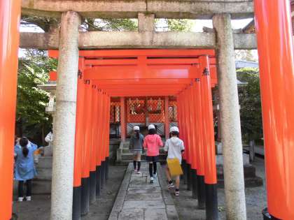 社会見学で藤森神社に行きました。神社の中を班で見学して回りました。鳥居をくぐったり水で手を清めたりしました。