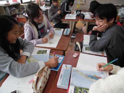 算数の学習で,25万分の1の縮図を活用して琵琶湖や淡路島の面積を求める学習に取り組みました。