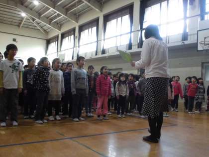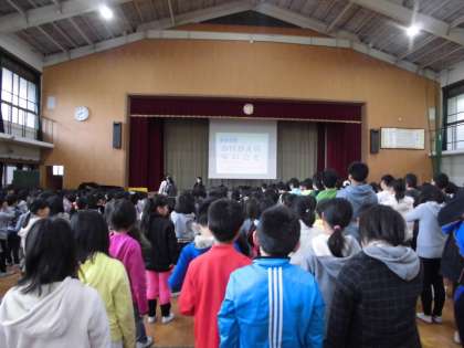 今日は音楽集会がありました。全校で「かけがえのないこと」の練習をしました。音楽の堀池先生にしどうしていただき、「響きを美しく」「音の長さを正確に」のポイントに注意して歌いました。