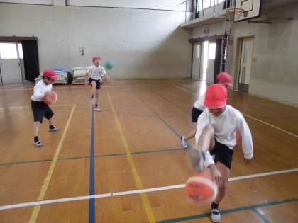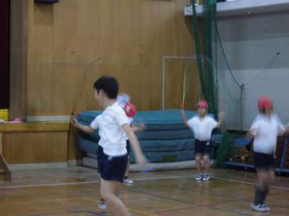 用具遊びで「なわとび」と「鞠つき」をしています。鞠つきはだんだん上手になってきて、歌を歌いながらリズムに合わせてできるようになってきました。なわとびもできる技が増えてきました。