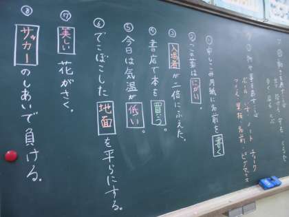国語で「言葉の分類」の勉強をしました。「動きを表す言葉」「様子を表す言葉」「物や事を表す言葉」の3つの種類に分類しました。文章に合う言葉を見つけ、その言葉がどのグループに当てはまるかを考えました。