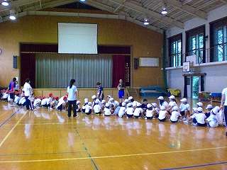 2校時は,綱引き,ゲームリレー,紅白対抗リレー,3つのチャレンジ種目の練習を予定していましたが,雨のため屋内で競技の説明を聞きました。