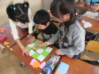 正方形を2つつなげると長方形になったり,直角三角形を4つならべると正方形になったり,楽しい活動を通して,形についての理解を深めました。