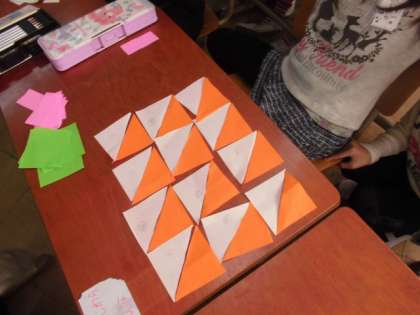 今日は,正方形や長方形,直角三角形を敷き詰めて,きれいな模様を作りました。