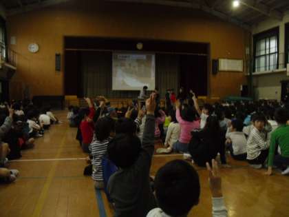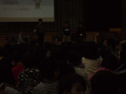 5年生のかめのこタイムがありました。スチューデントシティでの学習についての発表でした。京都銀行・区役所などの仕事について劇で発表してくれました。クイズもあり,見ている人が考えられるようになっていました。1年にとっては,難しい内容でしたが,静かに発表を聞き,クイズにも参加できました。