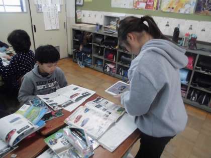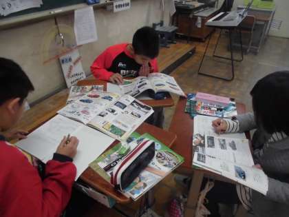 社会では,「自動車をつくる工業」の学習をしています。今日は,人と環境にやさしい自動車づくりについて調べました。ハイブリッドカーや電気自動車など,子どもたちも知っている言葉も多く,興味をもって色々と調べる姿が見られました。