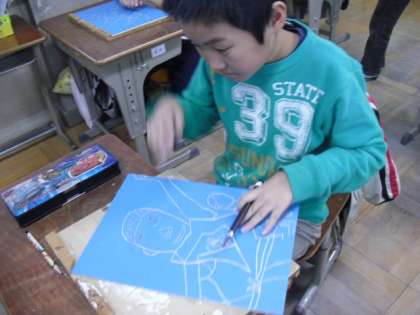 なんとか彫り進められるようになってきました。自分の下絵がだんだん彫りあがっていくのがとてもうれしそうな子ども達です。