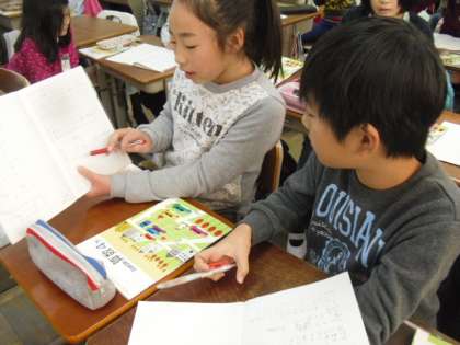 (小数)×(整数)の計算の学習に入って、3時間目。ただ単に答えを求めればいいのではなく、その答えを出すために自分がどういうやり方をしたか、説明することを大事にして進めてきました。ノートにきちんと書けていることでも、相手に分かるように伝えることはむずかしいことです。