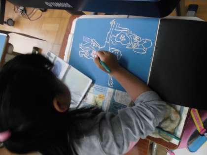 彫刻刀を使って掘り進めていった版が出来上がり,今日から色付けに入りました。黒の背景に映えるように,明るい色を選んで塗ったり,白をたくさん混ぜて自分オリジナルの色を作ったりして作品を作成していました。自分の肌の色と比べて,「少し赤を足そう!」「少し黄色を足そう!」と色混ぜの工夫もたくさん見られました。次の時間も引き続き色塗りを進めていきます。