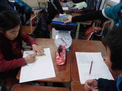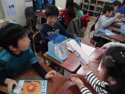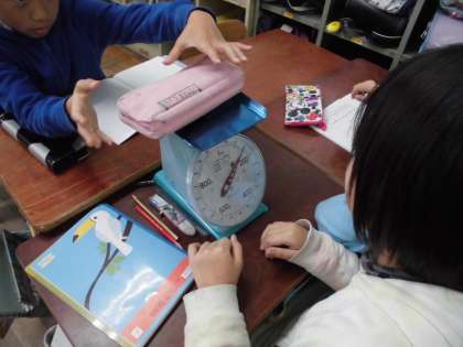 算数で「重さ」の学習をしています。理科でも重さの学習をしているのですが、はかりの使い方を復習してから身の回りのものの重さを量りました。kgばかりとkgばかりのメモリの読み方に気を付けました。