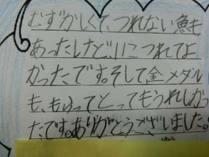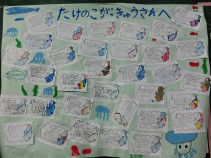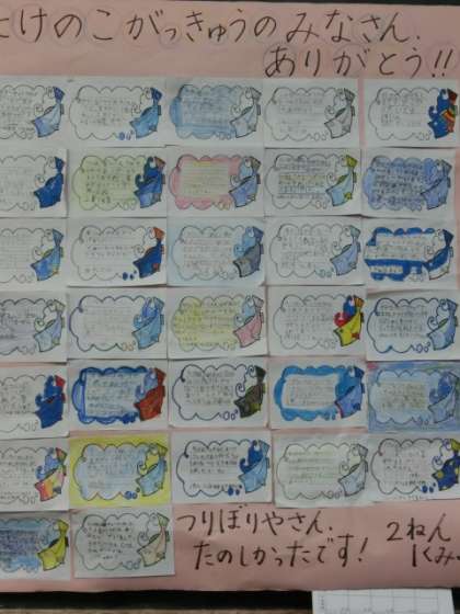 先日、2年生からお礼の手紙をもらいました。釣り堀のお店屋さんのお礼の手紙です。いただいて、みんなで読みました。「うれしいな。」「こんなこと書いてくれているは。」「またしたいな。」などと、わいわいがやがやとひとしきり読みました。たけのこ学級の廊下に掲示しますので、学校に来られた時には、ぜひご覧ください。