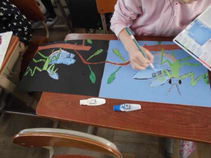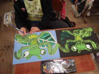 版画の色付けをしています。自分の決めた色に白を少し加えて発色が良いようにして、丁寧に色を付けています。味のある「カマキリ」ができてきています。