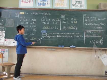 重さの計算の復習をして、今日はいろいろな単位についての勉強をしました。mm(ミリメートル)とm(メートル)の関係、ml(ミリリットル)とl(リットル)の関係、またg(グラム)とkg(キログラム)の関係を調べました。1000個集めると単位が変わることに気が付きました。新しく、t(トン)という単位も覚えました。