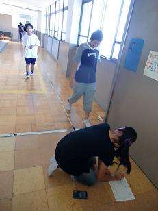 6年2組は実習生さんと算数に取り組みました。速さの学習で、自分たちの歩く速さの求め方を考えてグループ活動で調べます。メジャーとストップウォッチを使って、歩く秒速を求めました。