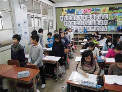 学習発表会へ向けて取り組んでいます。今日は1〜4の場面と5〜7の場面に分かれて練習をしました。京都の歌も歌って振付も覚えました。