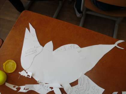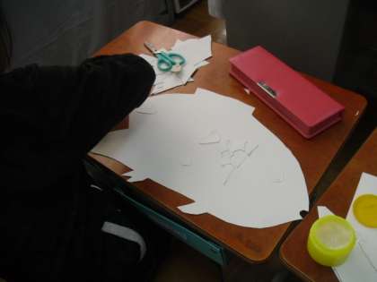 アイデアスケッチを描いた後,画用紙で版を作りました。魚の形を作った後,目やひれを付けたり,模様を付けたりしていきました。それぞれ考え工夫しながら,作っていました。