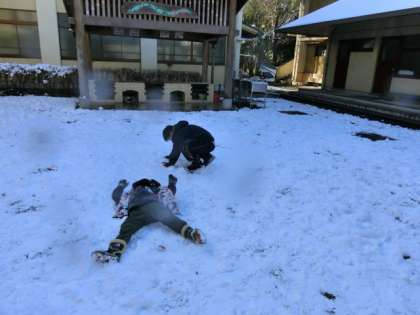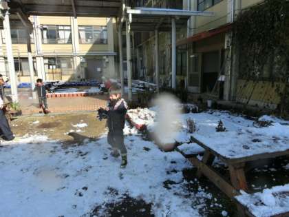 14,15日と、ずいぶん雪が降りましたね。皆さんのところではどうでしたでしょうか。被害はありませんでしたか。登校途中の、橋では、歩道が凍結していて、そろりそろりと、歩いてきました。学校の前の上り坂は、車道の雪はほとんどありませんでしたが、歩道は何か所か凍結していました。学校に来ると、中庭は日陰なので雪がたっぷり残っていました。そこで、1時間目に、みんなで中庭に出て雪遊びをしました。みんなは、歓声を上げて中庭に飛び出していきました。もちろん、子供たちの狙いは、雪玉あてです。日ごろの恨み(?)を、晴らすかのように担任を狙ってきます。この時ばかりは、みんなが狙ってくるので多勢に無勢。全身雪まみれになりました。雪玉あてに飽きた子供は、雪の上に大の字になって、雪の感触を楽しんでいました。