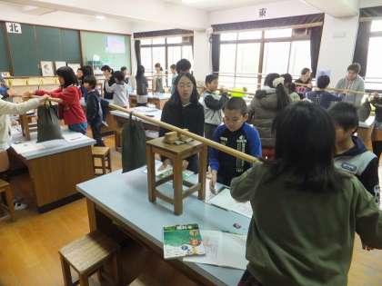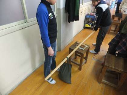 今日は棒を使って10kgおもりを小さな力で持ち上げる方法を調べました。棒をてことして使うと,とても小さな力で持ち上げることができました。支点・力点・作用点の位置を工夫すると手応えが全く違うことが実感できました。