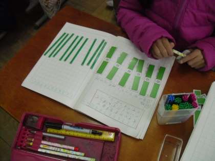 大きい数を数字で書いたり、数え棒を数えて並べたりする学習をしました。「10がいくつとばらがいくつ」ということがわかってきたようです。
