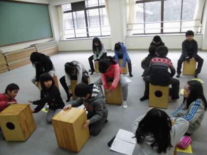 学習発表会に向け,カホンと足踏みのグループは「カホン」と「足踏み」の2つのパートに分かれて練習しています。基本的には,カホンと足踏みに分かれて,違った動きをするのですが,2つのパートが同じリズムを叩くところもあります。全員で同じリズムを叩く時は,強弱に気を付けて演奏したいと思います。