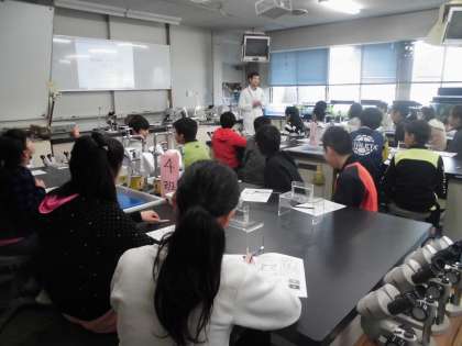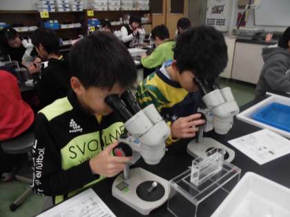 最初は,クラスごとに分かれて学習をしました。2組は,アルテミアという生物が「生きてる化石」と言われるほど,数億年前から形を変えずに現在まで生存している秘密をさぐる学習をしました。顕微鏡で細かい部分まで観察したり,映像を見たり,興味をもってその秘密を探ろうと取り組んでいました。