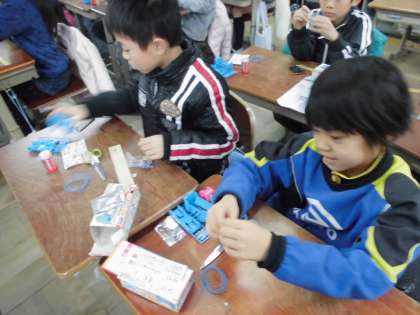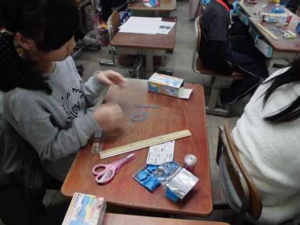 理科で「豆電球にあかりをつけよう」の学習をしています。まずは実験に使う道具の準備をしました。導線の長さを測って切り、ビニールをはがしました。初めて扱う道具でわくわくしながら準備しました。