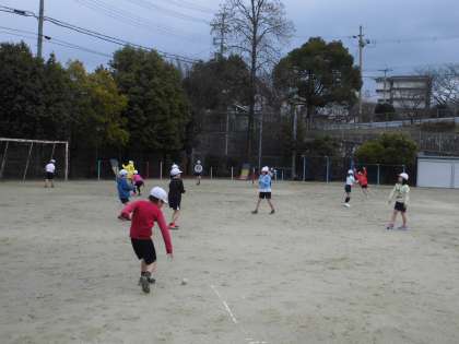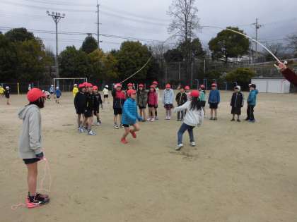 体育で「なわとび」と「ハンドベースボール」をしています。なわとびでは短縄で個人技の練習と大縄跳びの練習をしました。ハンドベースボールはペアでキャッチボールをしました。