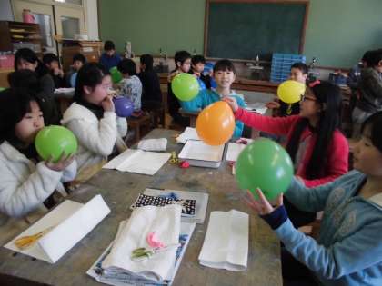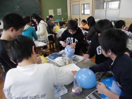 2組でも「ぱっくりたまご」の学習が始まりました。今日は,たまごの殻を作りました。たまごの殻は,膨らませた風船のまわりに和紙をのり付けして貼っていくと完成する仕組みです。子どもたちは一枚一枚丁寧に和紙を貼っていました。このたまご達が,これからどんなたまごに変化していくのか楽しみです。