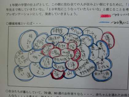 今日はその第1回目の授業でした。自分たちの街の特徴について思いついたことを挙げていきました。はじめは,なかなか意見が出なかったのですが,グループで話していくとたくさんの意見が出てきました。